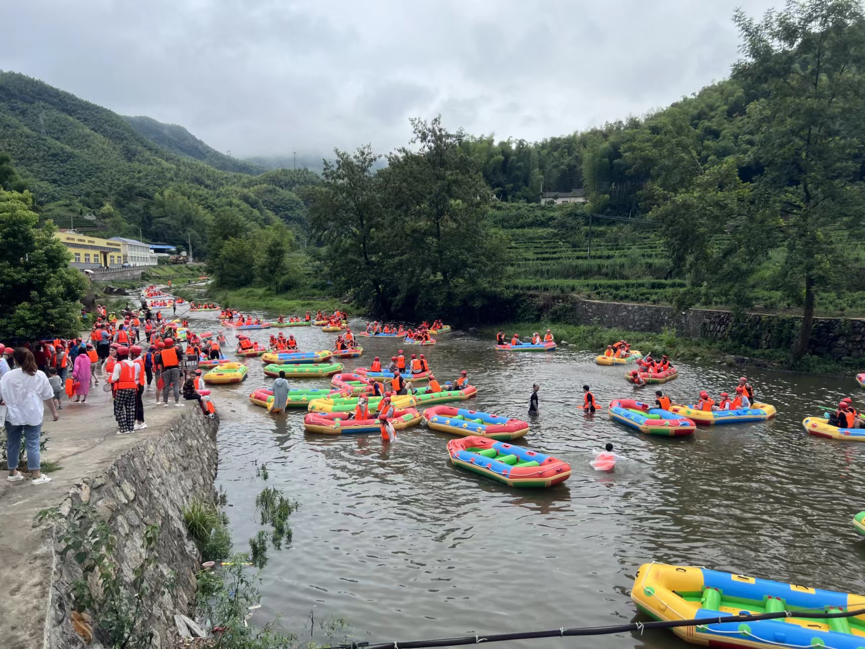 在经过有序的排队等待后,大家依次到达漂流出发点,组队坐上皮划艇,一个个随水流急剧而下,穿石绕壁,高潮迭起,水花声、尖叫声此起彼伏,开始了一场水上的速度与激情。